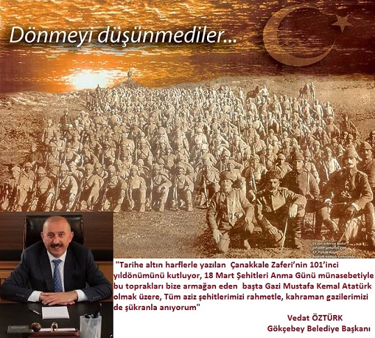 Gökçebey Belediye Başkanı Vedat Öztürk, “18 Mart Şehitleri Anma Günü ve Çanakkale Zaferi’nin 101’inci Yıldönümü” dolayısıyla bir mesaj yayımladı.