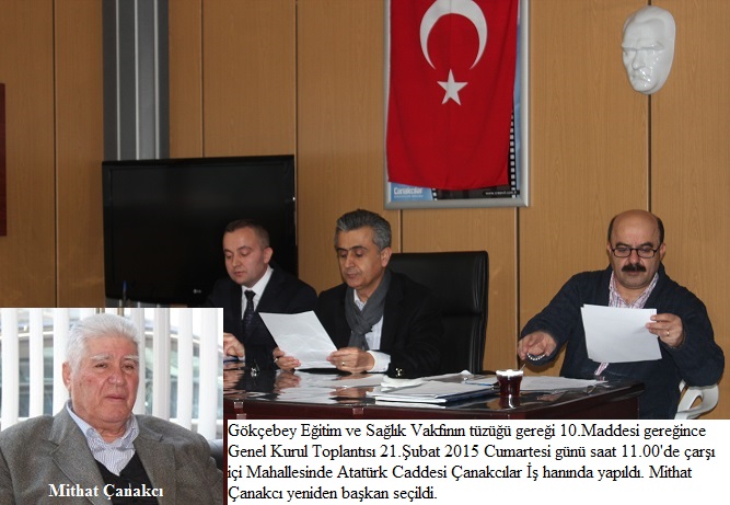 Gökçebey Eğitim ve Sağlık Vakfının tüzüğü gereği 10.Maddesi gereğince Genel Kurul Toplantısı 21.Şubat 2015 Cumartesi günü saat 11.00'de çarşı içi Mahallesinde Atatürk Caddesi Çanakcılar İş hanında yapıldı.