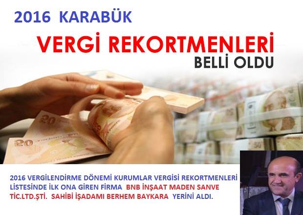 KARABÜK 2016 VERGİLENDİRME DÖNEMİ KURUMLAR VERGİSİ REKORTMENİ MESCİER DEMİR ÇELİK SANAYİ VE TİCARET LTD. ŞTİ. OLURKEN, 2016 VERGİLENDİRME DÖNEMİ ( GELİR VERGİSİ ) TİCARİ, ZİRAİ, SERBEST MESLEK KAZANCI REKORTMENİ, DURSUN SALTOĞLU OLURKEN LİSTETEDE İLK ONA GİREN FİRMA İSE BNB İNŞAAT MADEN SANVE TİC.LTD.ŞTİ. SAHİBİ İŞADAMI BERREM BAYKARA OLDU.
